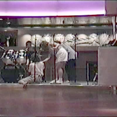 2 teen girls pretend to play guitars, another teen girl pretends to play the drums and keyboard. They lip sync to the song "Walking on Sunshine." The girl pretending to play drums slips & falls off her chair, knocking over the keyboard. Short tails.