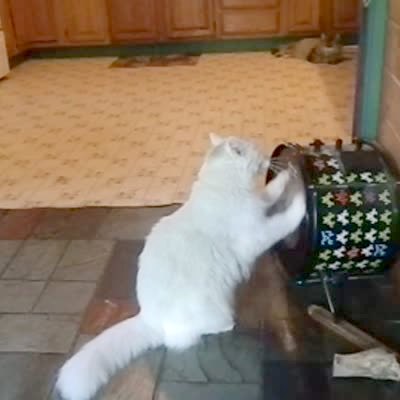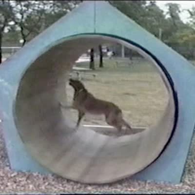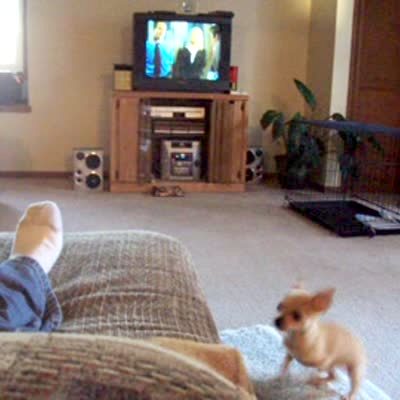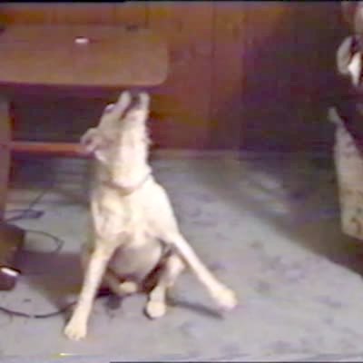 "Doggie Drummer" Man tells his dog to give him a beat. Dog steps on the kick drum pedal & creates a beat. Silly pet trick. Music.