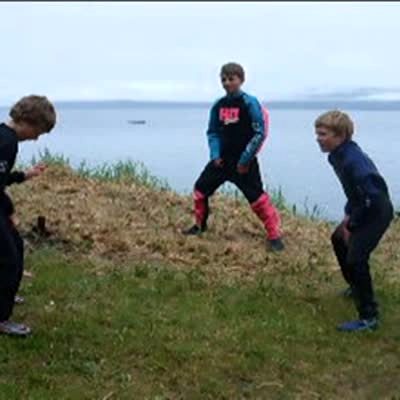 3 boys hit the fabric between their legs to make drum sounds. Boys are wearing wet suits near the water.
