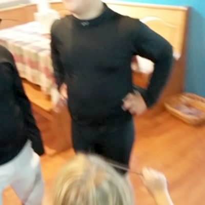 Two boys wear part of their football uniforms indoors and laugh as their older brother plays drums on their protective cups.