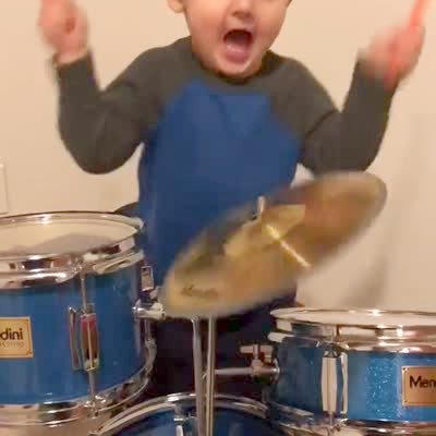 Teen boy plays drum set in bedroom, shelf of trophies falls down and crashes into drums, boy just keeps on playing. kids.