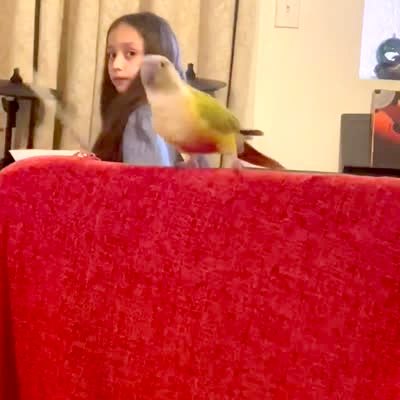 A young girl plays the drums and a bird walks into the frame and dances in the living-room.