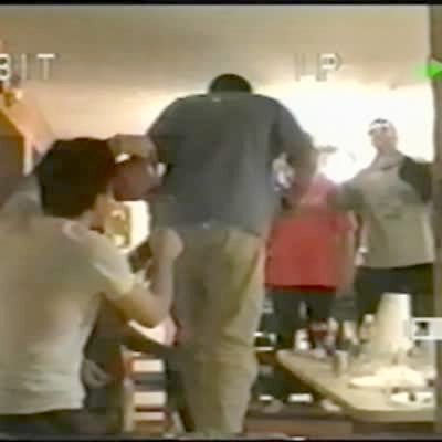 A man s and crashes through a wooden door at a party. Music rights not cleared.