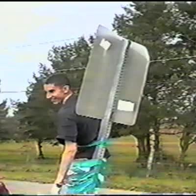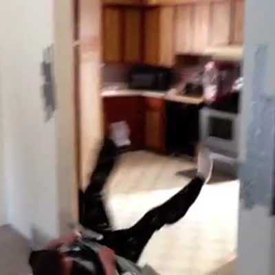 A man runs into a doorway that has a ton of duct tape across it. He bounces off and falls to the floor.