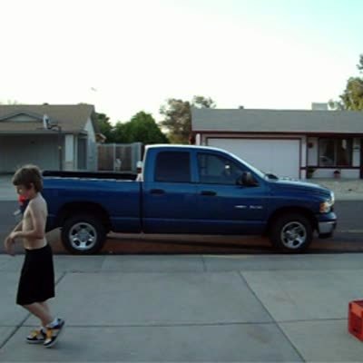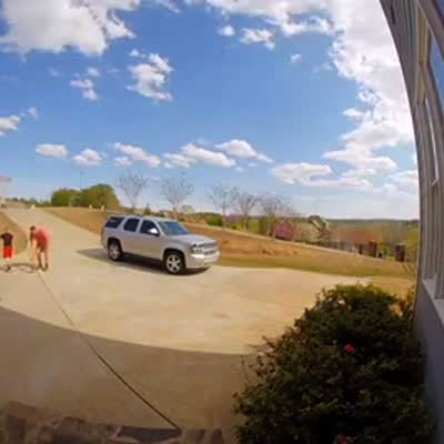 A man sits in a lawn chair for an Ice Bucket Challenge before his son and two daughters try to push a cooler of water over the porch railing behind him at 1:05:00. When it won't move, they whine that they can't do it and the boy pushes harder, causing the entire cooler to fall on the man's head before a younger child is heard crying. ALS Ice bucket challenge.
