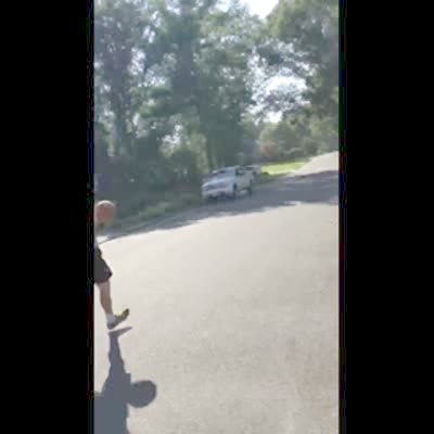 A man tries to dunk a basketball, but he misses and it bounces onto a tot boy in a toy car.