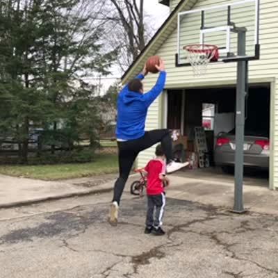 A man runs and tries to jump over his young son to dunk a basketball in a hoop in slow motion. He accidentally hits his son with his leg and the boy falls down.