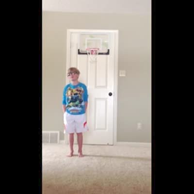 A teen boy does a trick shot on a door hoop in his bedroom, and then he acts like he is cool and shoots the ball over his shoulder, but the ball hits a mirror on his dresser and breaks it.
