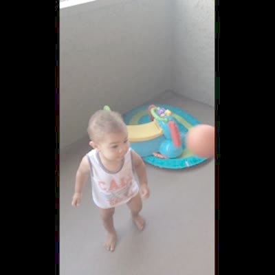 A toy basketball hoop falls on a tot boy when he dunks a ball into it in the living room.