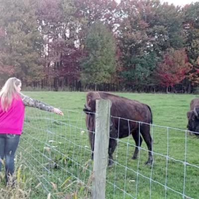 A teen girl tries to feed an ear of corn to a buffalo that charges the fence and scares her outdoors.