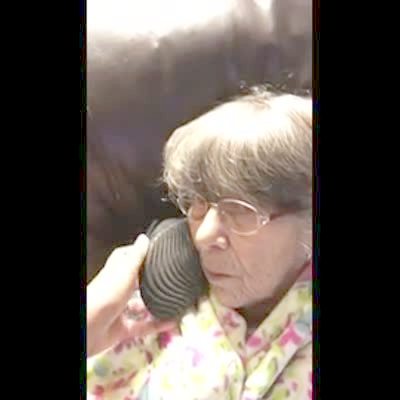 A teen girl places a shoe against her grandmother's ear on a living room couch and pretends it's a phone and someone is on the other line and the grandma talks into the shoe as if it were a phone.