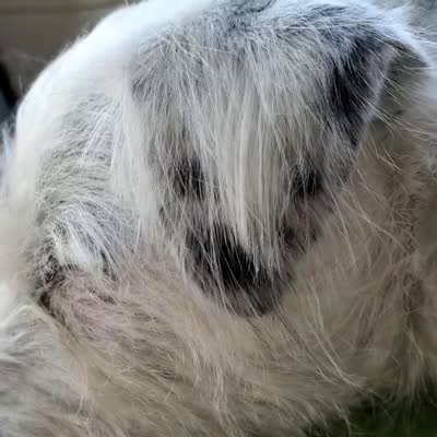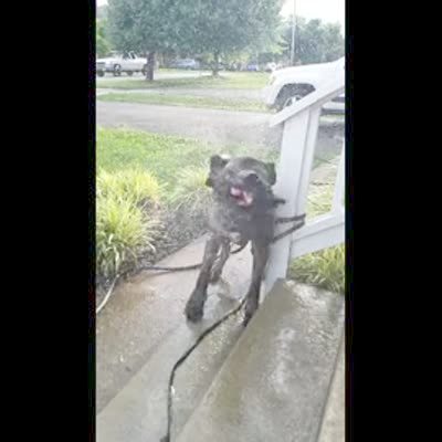 A dog shakes itself dry in slow motion. The dog's ears and jowls flap.