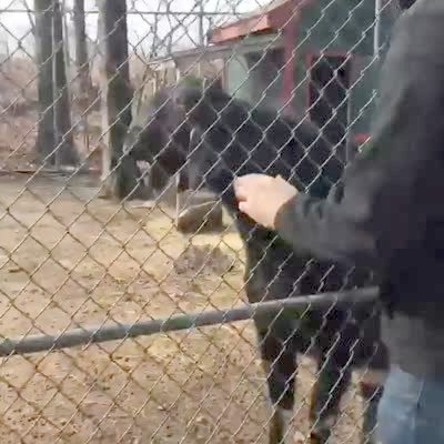 A man touches a goat's ear at a ranch, and the goat yells back at him repeatedly.