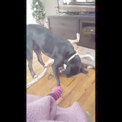 Two dogs play together on the floor. A woman says "squirrel" and both dogs stand up and perk their ears as they look around.