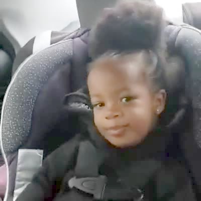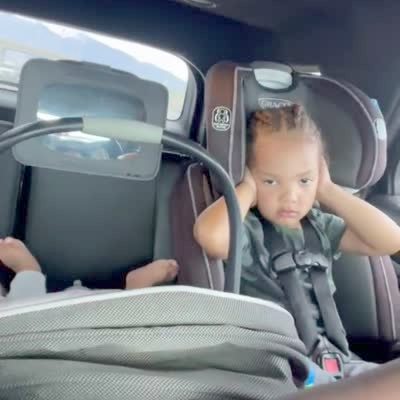 A baby girl cries as a young girl covers her ears while mom laughs in a vehicle.