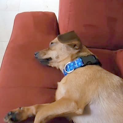 A dog sleeps on the couch and it's ear lies flat and slowly lifts up and stands straight in the living room.