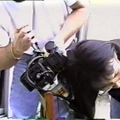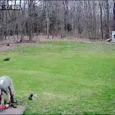 A man struggles to start up a weed-eater in the yard and he gets mad and starts to bang it on the ground. Parts of it start to break off and then he throws it and goes back inside. Security camera footage with no audio