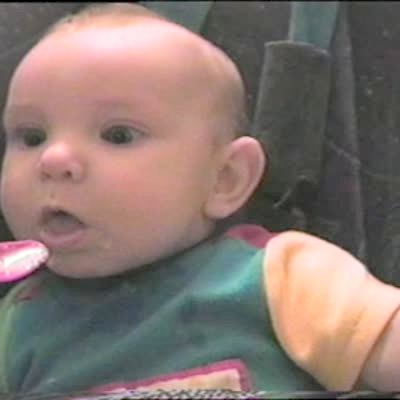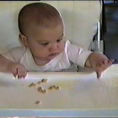 FLY EATER. Baby in highchair harassed by fly, eats it.