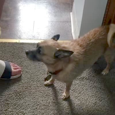 A man offers a dog in a living room a chip and it doesn't want it. He offers the dog the same chip with dip on it and the dog eats it.