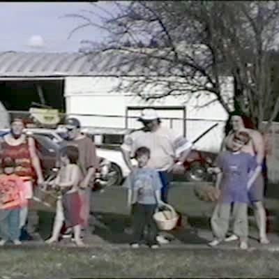 Boy on an Easter egg hunt hits a man in the crotch who jokingly steals his Easter basket. *tracking off .