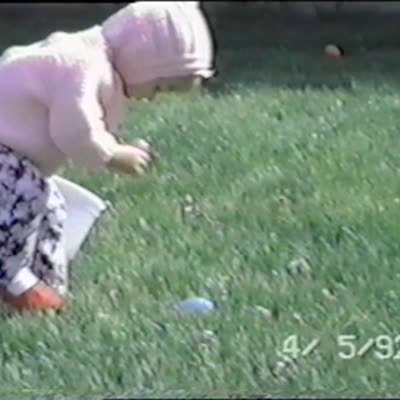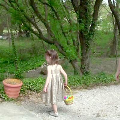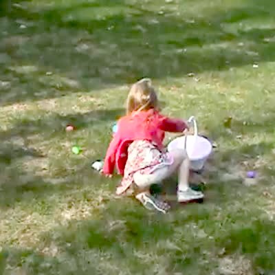 Tot girl on Easter egg hunt finds golden egg. She walks back to her basket, trips & falls, breaks the gold egg.