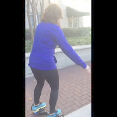 A senior woman stands on an electric skateboard outdoors when it spins and she falls off. hoverboard