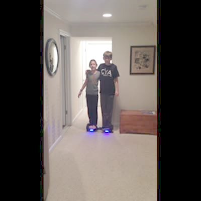 A boy and girl ride on an electric skateboard and ask to see more hoverboard videos.