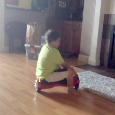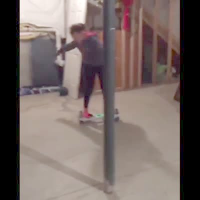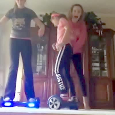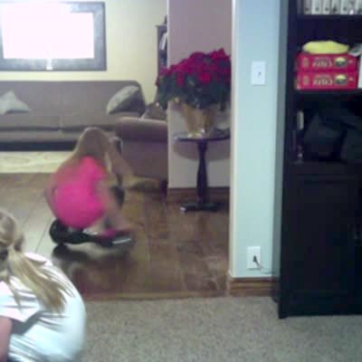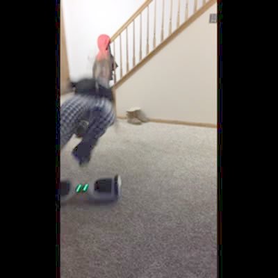 A young girl can't stop spinning on an electric skateboard and then slams in to a wall. A photo of the broken wall is added to the end of the video. hoverboard