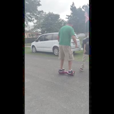 A man gets on an electric skateboard outdoors with the help of his son and then rides it around and then falls. hoverboard