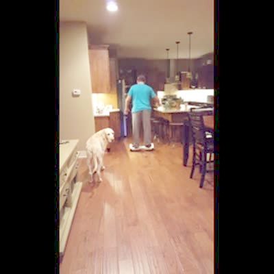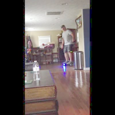 A man rides an electric skateboard and falls off when his daughter hits him indoors. Short tail. hoverboard