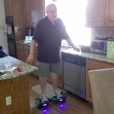 A senior man sits on an electric skateboard indoors and it spins him until he falls off. hoverboard