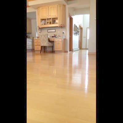 A woman rides an electric skateboard indoors when she bumps into a counter and falls off. hoverboard