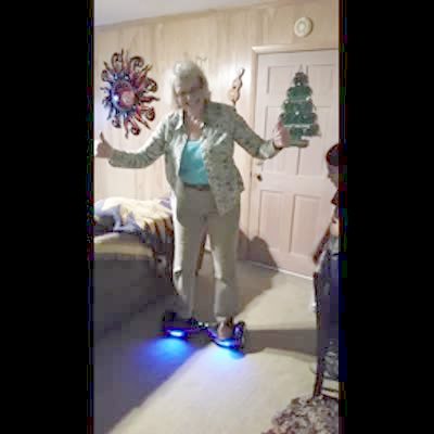 A senior woman rides an electric skateboard indoors. She does well at first but hits a bump and falls. hoverboard