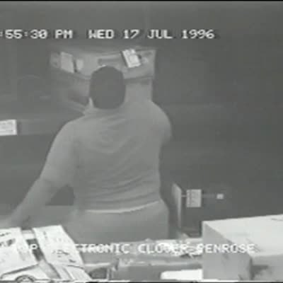 A woman accidentally knocks over a wall of cans in a warehouse causing a domino effect. Security footage.