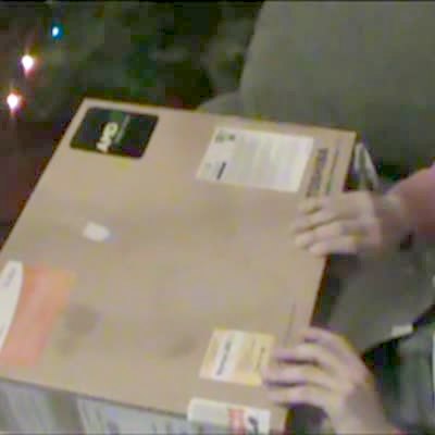 A woman unwraps a gift on Christmas and gets excited to see an computer box. She opens it and realizes she's being proposed to, but still asks if there's a laptop for her somewhere. Proposal