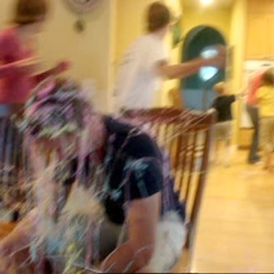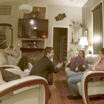 Engaged young couple sits in dining chairs in living room and gets silly stringed by the girl's family. prank / practical joke