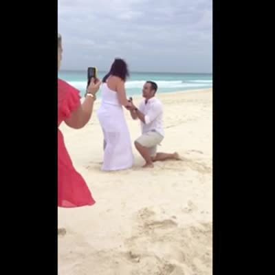 A man proposes to his girlfriend on the beach in the middle of their photo shoot and she cries and says yes, and then his sister in law falls in a sand dune as she tried to take a picture.