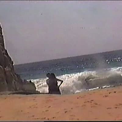 Man tries to propose to woman on a beach while the tide rolls in. Huge wave crashes as they kiss.