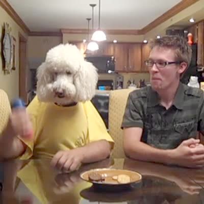 Poodle dog with human hands sits next to man at a table, and they both engage in contest like throwing a football and lifting weights.