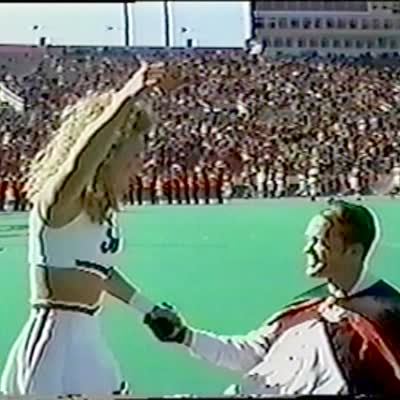 Man dressed as mascot of college football team carries cheerleader into end zone and reveals himself to propose to her. football game. (3 camera POVs)