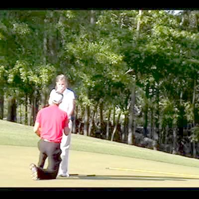 Man proposes to woman on golf course. Can't hear anything. Proposal, engagement.