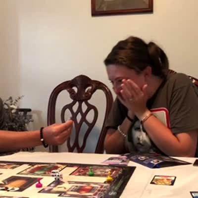 A man and a woman play the Clue board game with her family, and she gets a clue that says "in the church with a wedding ring". She looks confused and he get on one knee and proposes. She says he is crazy but says yes and they kiss.