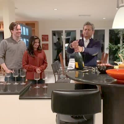 A man pops a bottle of champagne open and the cork hits a man in the crotch in a kitchen.