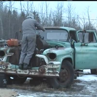 Father & son try to get an old truck to start. Dad puts gas in the wrong place & son turns the key, the engine explodes into a big flame. Fire. Boneheads.