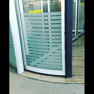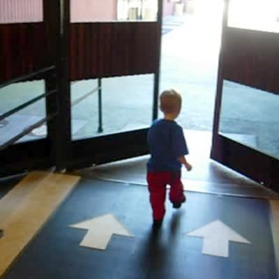 Tot boy runs in circles through automatic doors at the entrance of a building.