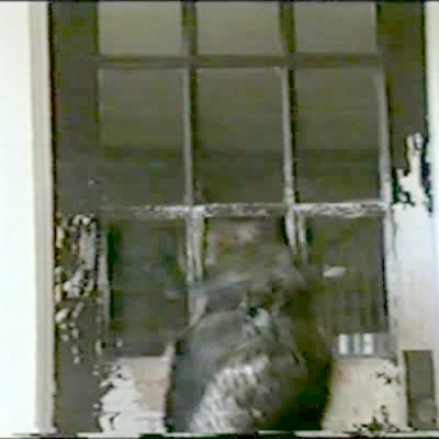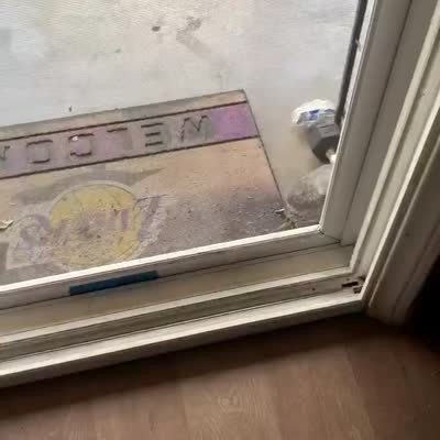 A dog walks into a sliding glass door. It then takes a long time before it enters the now open doorway. Security camera footage.