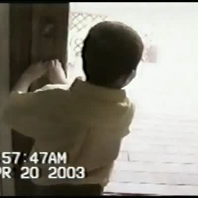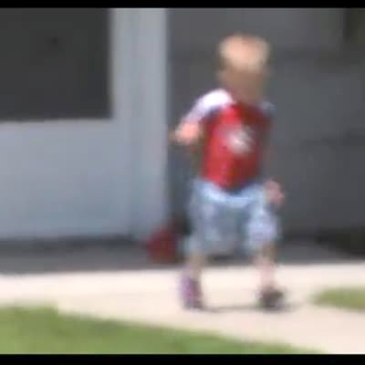 Tot boy falls through the screen door while trying to run into the house. Short tail, no recovery. No additional footage available from submitter.