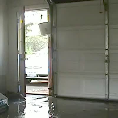 Teen girl walks into a garage from outside and a bucket of water from above the door falls down, splashes and soaks her. Practical joke, prank.
