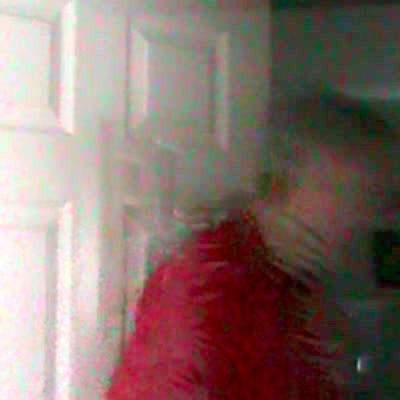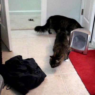 Two cats in the house one backs in to the door stopper and is surprised by it and jumps. It scares the other cat.