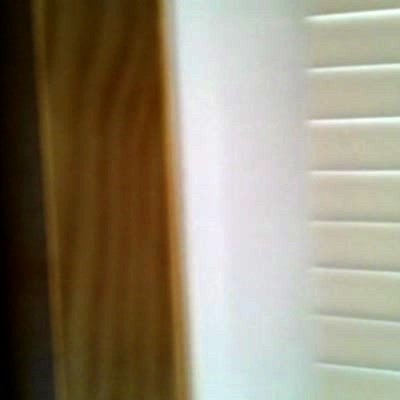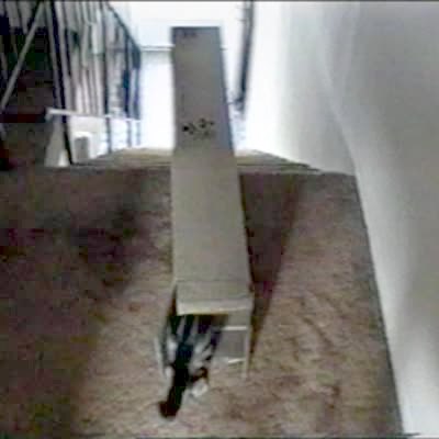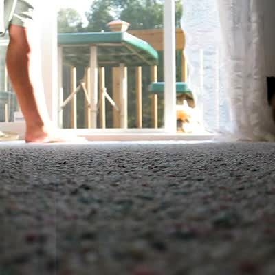 Man placed tape across doorway. At :17 a young girl walks under tape follow by a young boy who walks into it.